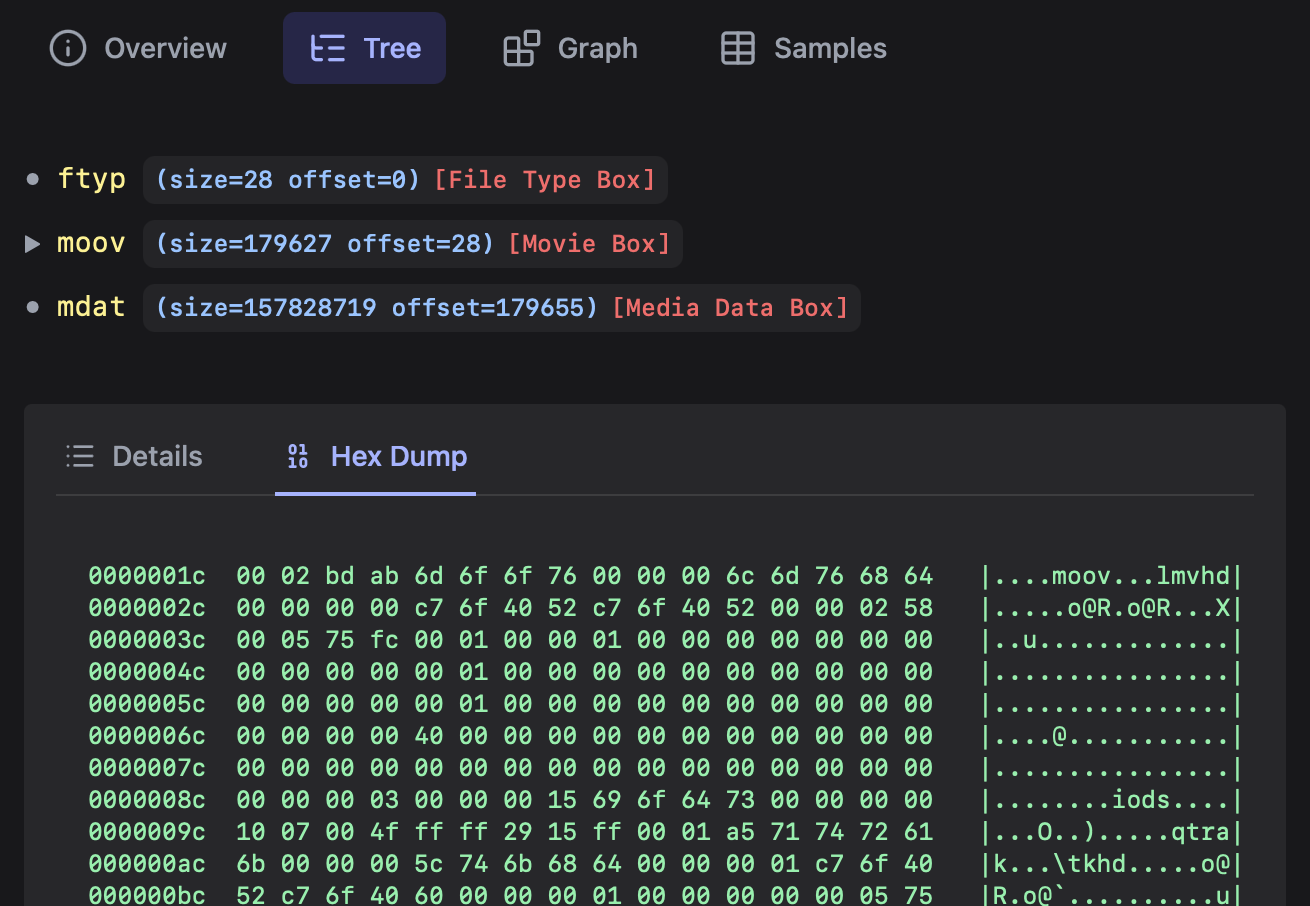 Sometimes you need to see the actual bytes. The hex dump panel in the Box Tree lets you view the raw bytes for any selected box alongside the parsed field breakdown. It's useful when something looks wrong in the parsed output and you want to verify it against the spec.