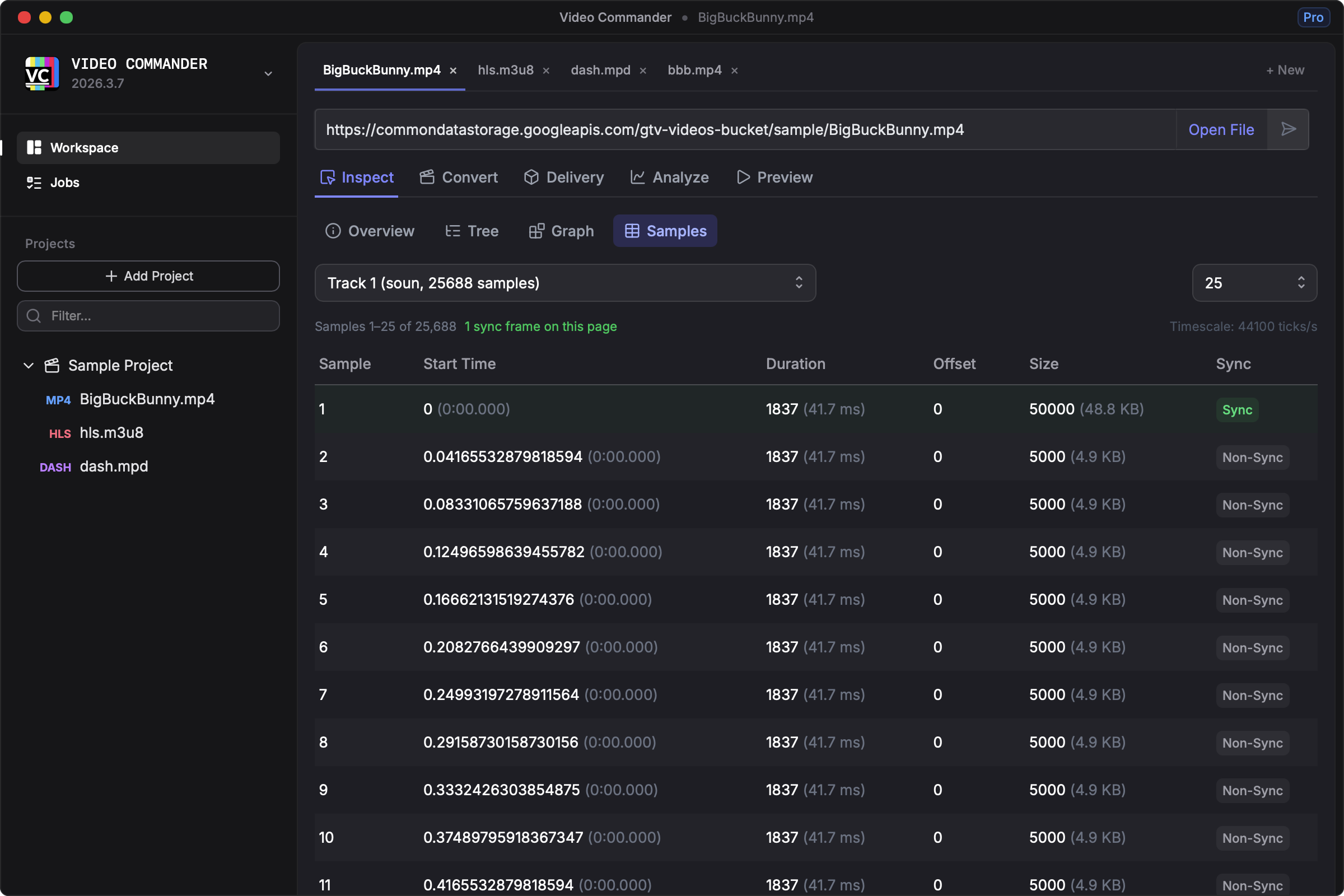 Beyond the container structure, the Samples tab lets you dig into the actual media data. Select a track and browse its sample table — timestamps, durations, sizes, sync points, and byte offsets into the file.